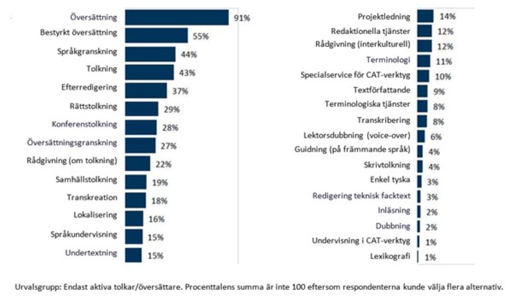 91 % av de svarande erbjuder översättning, 43 % tolkning och 37 % efterredigering (man kunde givetvis kryssa för flera av alternativen).