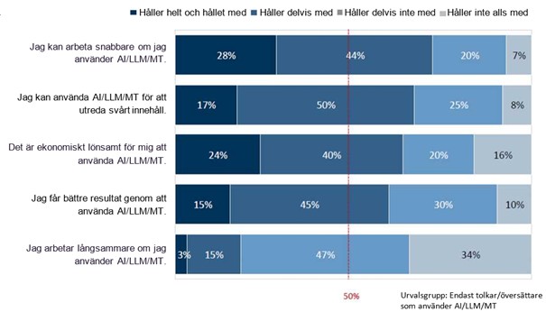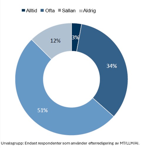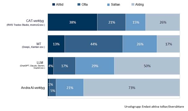 57 % använder alltid eller ofta maskinöversättning (MT) i sitt arbete och 21–27 % mer utpräglad AI.