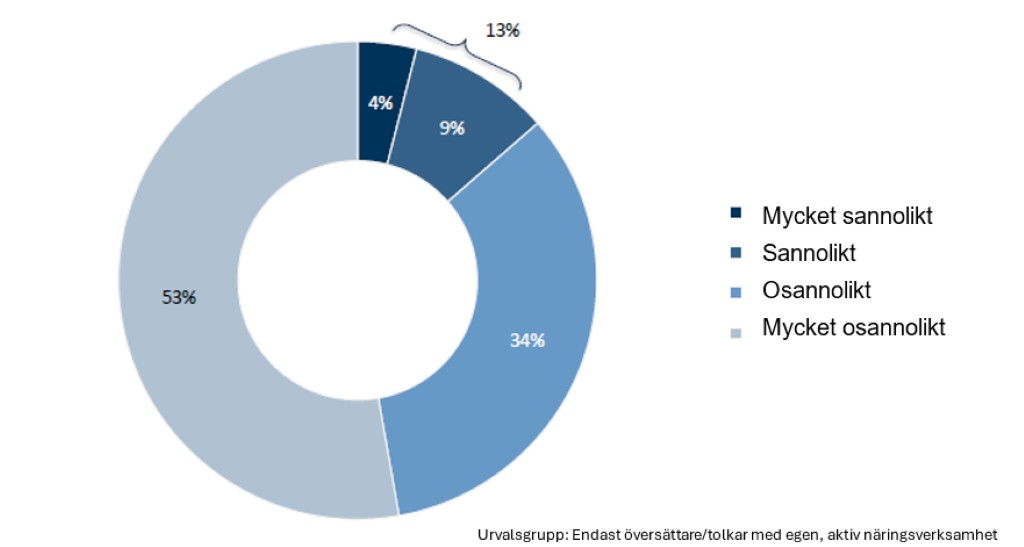 Inte så många fruktar att behöva ge upp sin verksamhet i närtid (inom 6 månader). 13 % ser detta som ganska eller mycket sannolikt, medan övriga förutser att de stannar i branschen. Här var fördelningen ganska likformig mellan tolkar och översättare och i de olika åldersgrupperna.