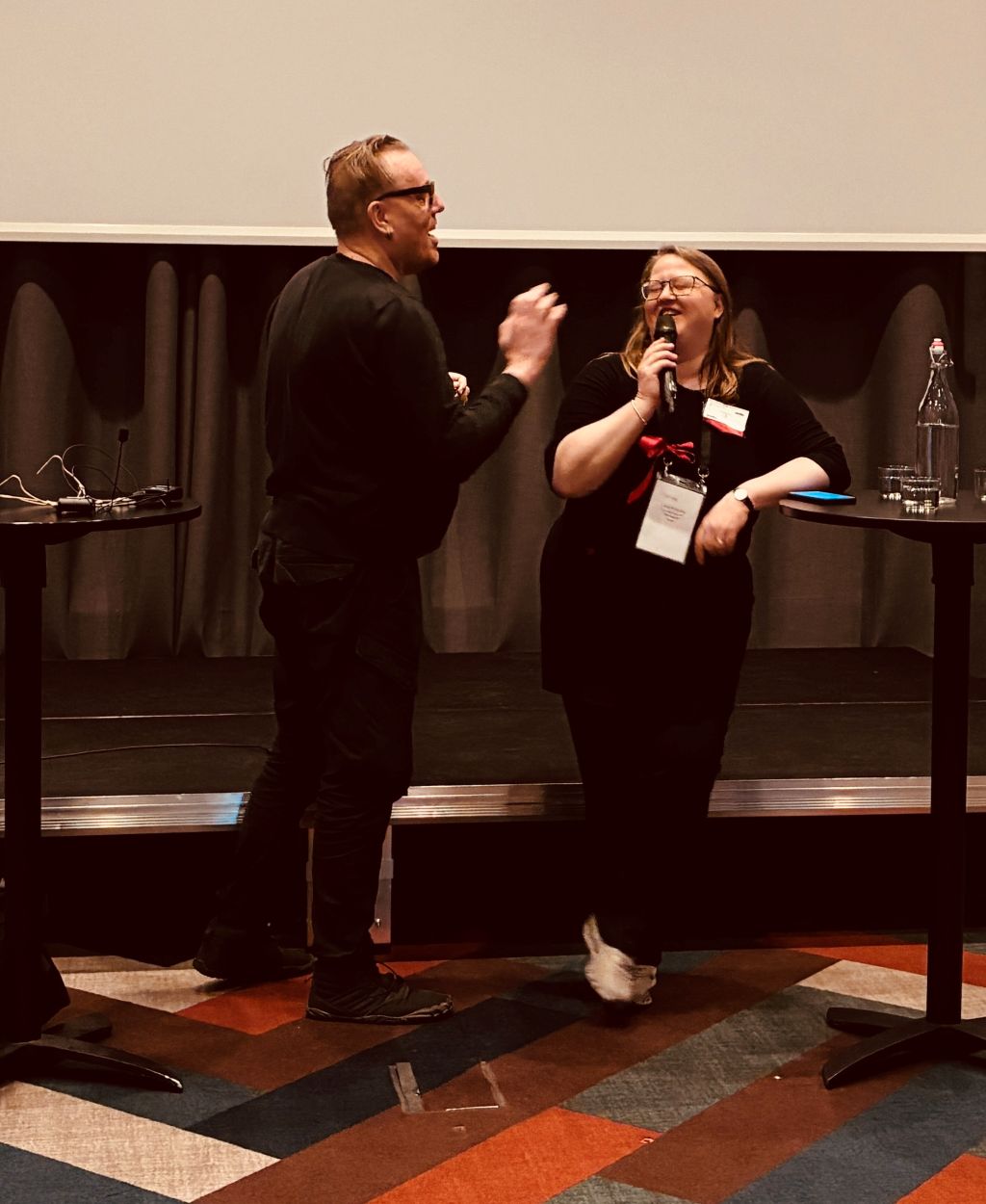 På föreningens konferens i Mölndal höll Lotta Hellstrand och Patrik Ganebratt en uppskattad workshop om hörsel- och talvård för tolkar. Lotta, auktoriserad rättstolk med mångårig erfarenhet, gav tips om hur vi kan skydda öron och röst vid telefontolkning och rättstolkning. Patrik, logoped och skådespelare, berättade om hur vi tolkar som använder våra stämband hela dagarna, kan vårda vår röst som ju faktiskt är vårt huvudsakliga arbetsredskap.